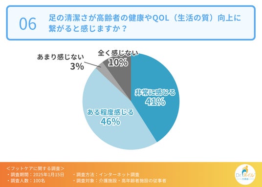 次に、足の清潔さが高齢者の健康やQOL(生活の質)向上に繋がると感じるか伺ったところ、「ある程度感じる(46.0%)」「非常に感じる(41.0%)」という回答が集まりました。