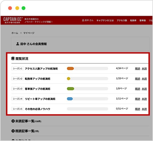 各シーズン(アクセス人数アップ・転換率アップなど)ごとに、未読の記事が一覧で表示されるようになりました。