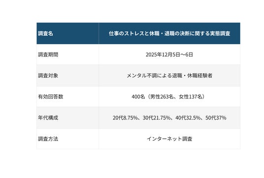 現役医師が運営する退職・給付金サポートサービス「TEATE(テアテ)」(本社:東京都中央区、代表医師:宗 大貴)は、メンタル不調による退職・休職経験者400名を対象に「仕事のストレスと休職・退職の決断に関する実態調査」を実施しました。