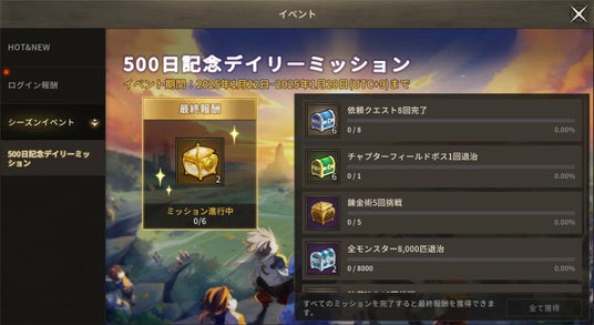 グルーバルサービス開始から500日と2025年の旧正月(春節)を記念して、本アップデートより、ゲームへのログインやゲーム内ミッションのクリアで、「+5唯一等級遺物選択箱II」や「11回燦爛たる召喚選択箱」などの豪華報酬を獲得できる、お得なイベントを多数開催いたします。