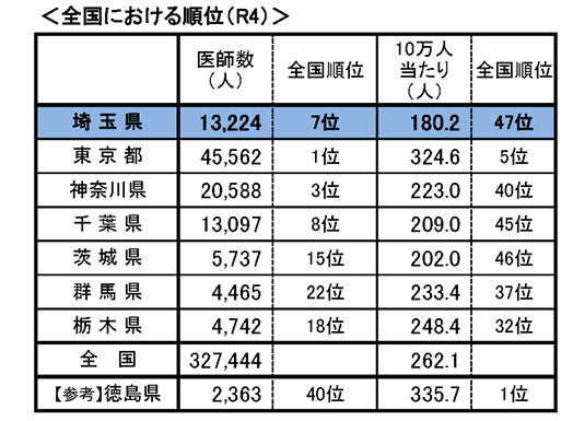 埼玉県の医師総数は13,224人で全国7位。人口10万人当たりの医師数は180.2人で全国最下位。 グラフ:「令和4年医師・ 歯科医師・ 薬剤師統計」(厚生労働省)を 基に 埼玉県作成より 引用