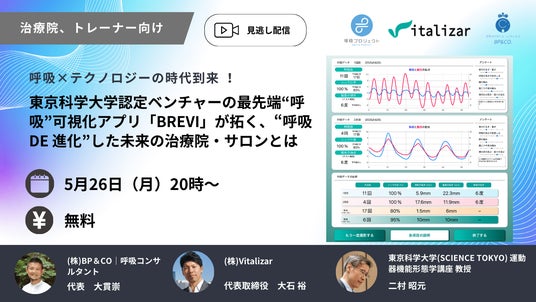 呼吸計測アプリ「BREVI」を開発中の株式会社Vitalizar(本社:東京都千代田区、代表取締役:大石裕)は、アークメディカルジャパン株式会社(本社:福岡県福岡市、代表取締役:坂元大海)が主宰する呼吸市場創造に向けた新組織「呼吸プロジェクト」へ参画し、日本初の呼吸コンディショニング導入支援サービスのオプションメニューとしてBREVIが採用されることが決定しました。また、本リリースを記念して、アークメディカルジャパン株式会社と2025年5月26日に無料オンラインセミナーを共同開催いたします。