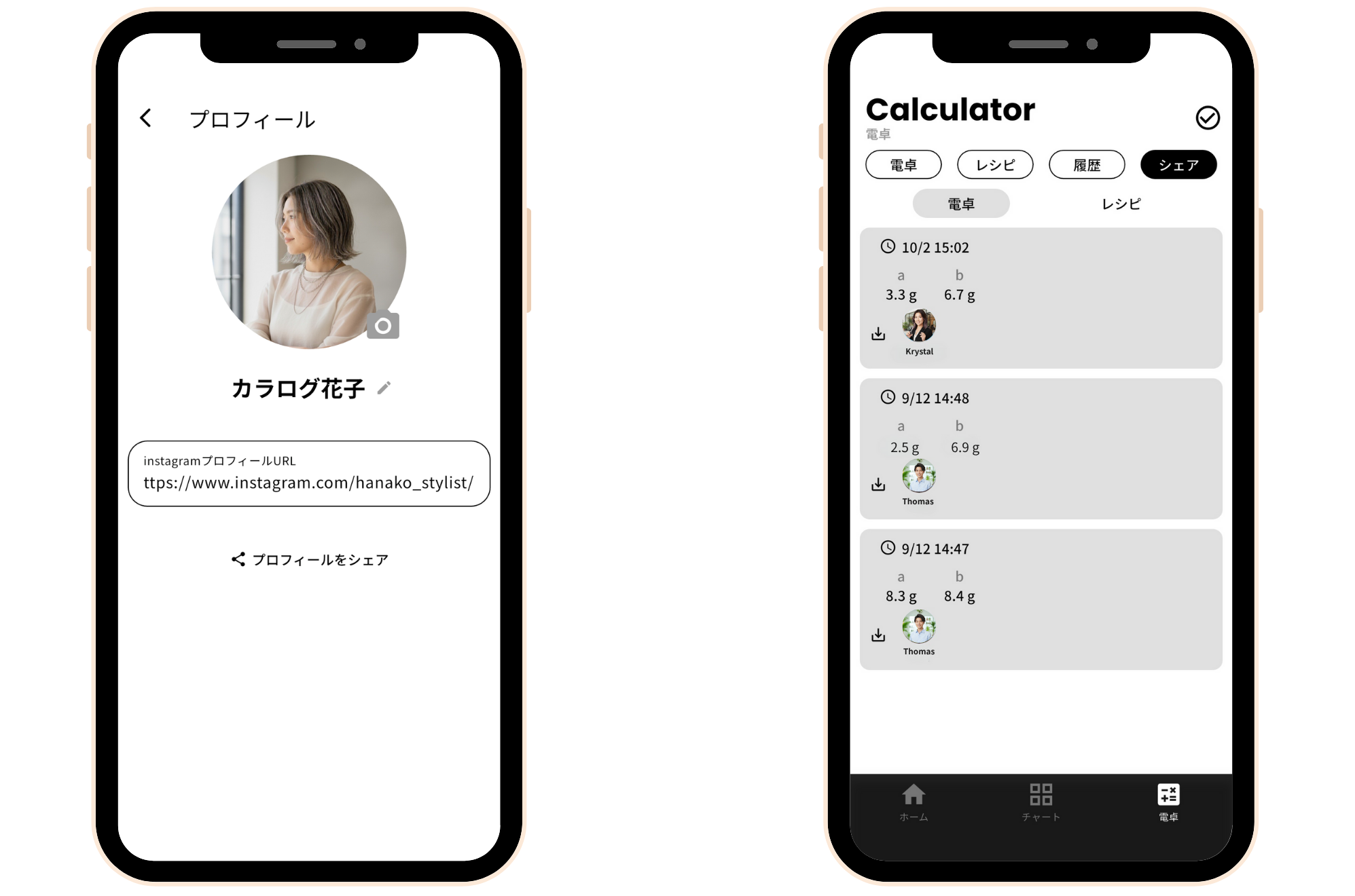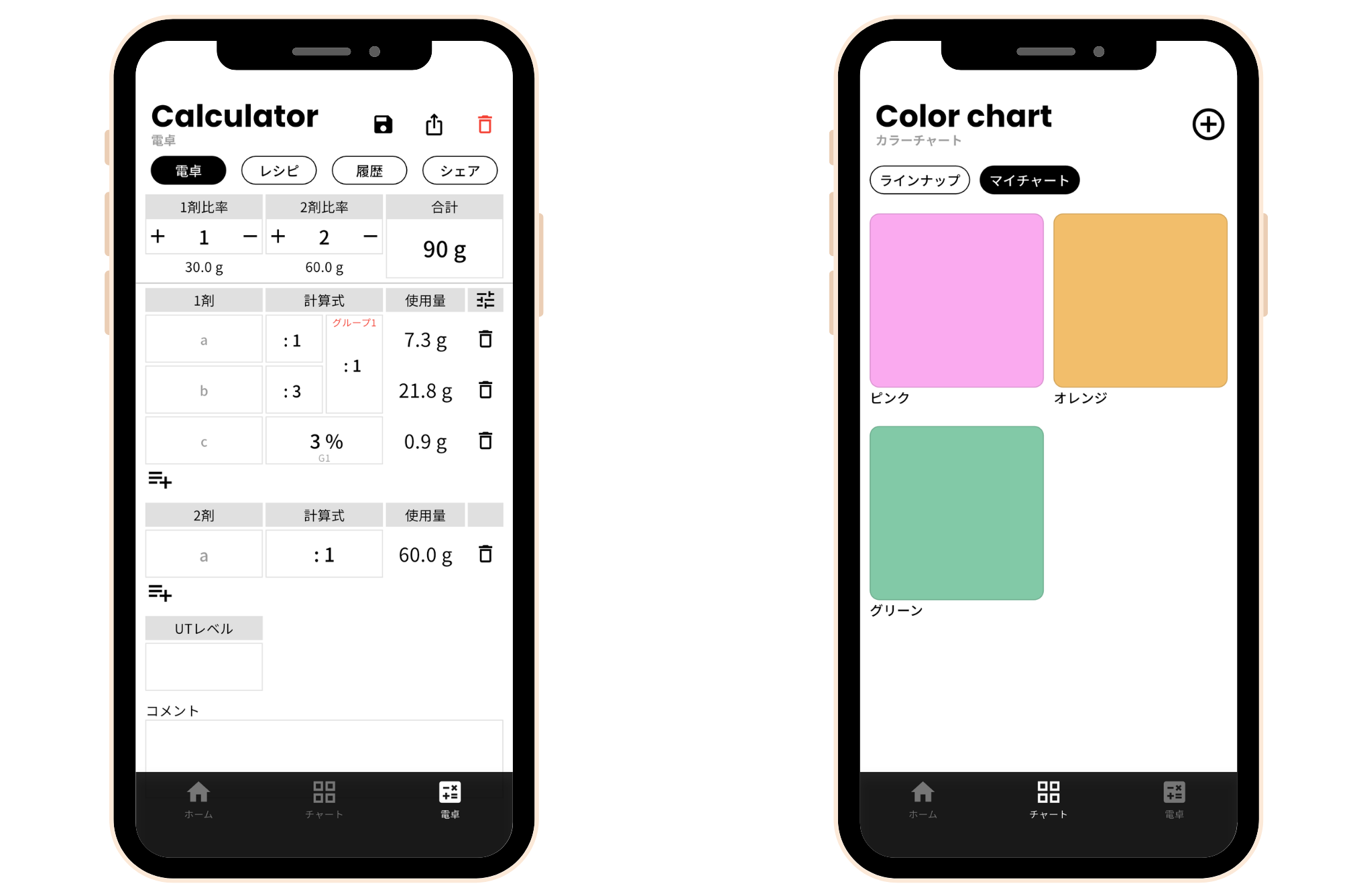 また、自動で調合計算ができる電卓機能、マイチャート機能、レシピ機能、シェア機能などを搭載し、現場でのヘアカラー選定や共有をサポートします。