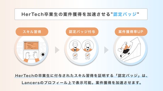 HerTechでは卒業生に対し実践の場での活躍を支援するため、Lancersと連携し「認定バッジ」の付与を開始いたします。このバッジは、HerTechが定めた水準を満たした卒業生にのみ発行され、Lancersの個人プロフィール上で確認可能となります。これにより、スキルの客観的証明として活用でき、発注側(発注者)からの信頼獲得や案件マッチング率の向上が期待されます。