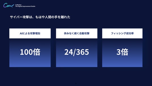 今回の講演では、AI技術の悪用により従来42時間を要していた攻撃ライフサイクルが25分に短縮され、侵入から横展開までの最短時間が51秒まで高速化した脅威の実態を詳細に解説しました。AIによる攻撃件数は100倍に増加し、24時間365日休みなく続く自動攻撃により、フィッシング成功率も3倍に向上しているという深刻な状況を報告しました。