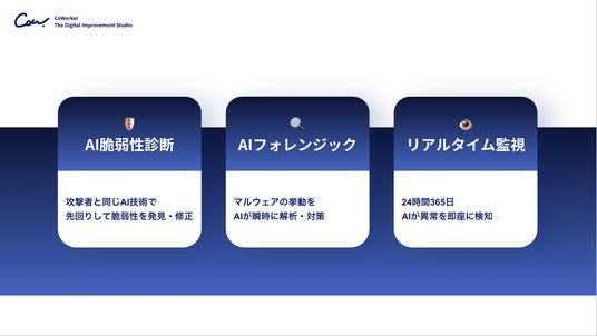 CoWorker株式会社は、高い技術力を武器に、システム開発・ITコンサルティング・セキュリティの3領域を展開する少数精鋭のAIテクノロジーカンパニーです。「Security × AI」で次世代セキュリティの研究開発を通じて、社会の安全基盤の強化に貢献しています。