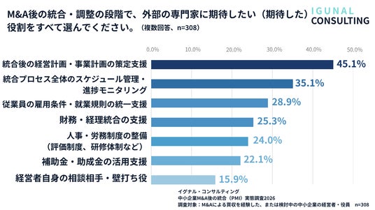 - 外部専門家に期待する役割の最多は「統合後の経営計画・事業計画の策定支援」(45.1%)、次いで「統合プロセス全体の進捗モニタリング」(35.1%)