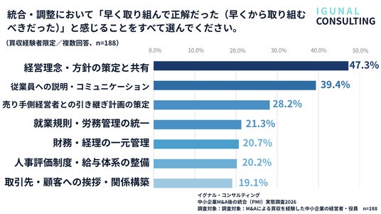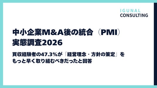 イグナル・コンサルティング(三重県鈴鹿市、代表:林 早苗、中小企業診断士)は、M&Aによる企業・事業の買収を経験した、または検討中の中小企業の経営者・役員308名を対象に、M&A後の統合プロセス(PMI:Post Merger Integration)の実態について調査を実施しました。