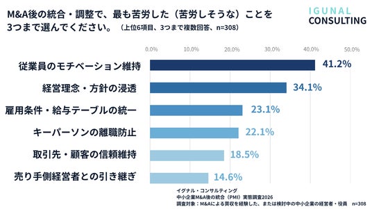 統合で最も苦労したのは「従業員のモチベーション維持」41.2%、財務・法務を上回る「人」の課題が浮き彫りに