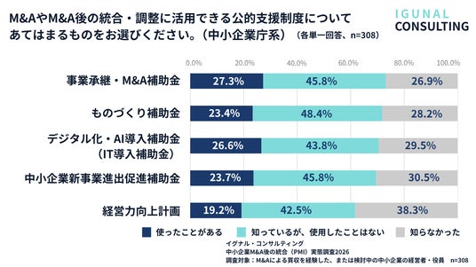 また、公的支援制度(補助金・助成金)の認知と活用の間にも大きなギャップがあり、「知っているが使えていない」状態が4割以上を占めます。情報源の中心が顧問税理士・金融機関・M&A仲介に偏っていることを踏まえると、PMIの実務領域における中小企業診断士・社会保険労務士などの存在感を高めること、また経営者が能動的に情報を取りに行ける窓口を整備することが、ギャップ解消の鍵になりそうです。