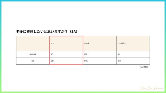 老後の移住意識について、64%が「いいえ」と答え、「はい」(14%)や「分からない」(21%)を大幅に上回り、シニア世代は移住に対して消極的な意識を持っていることが浮き彫りになりました。