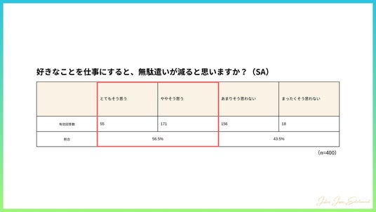 また、「好きなことを仕事にすることで無駄遣いが減るか」の質問に対し、過半数が「ややそう思う」(42%)、「とてもそう思う」(13%)と回答し、好きなことを仕事にすることで浪費の減少を実感していることがわかりました。