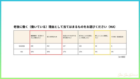 今回の調査では、老後も働く理由として「健康維持・生活のリズムを整えたい」(33%)、「収入を得るため」(30%)といった、老後も元気に働き続けたい傾向があることが明らかになりました。