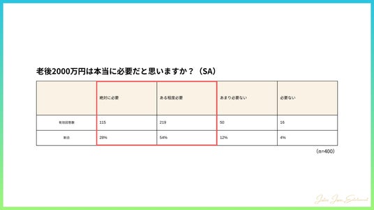 そして、約8割が老後に2,000万円は「ある程度必要」(54%)または「絶対に必要」(28%)と感じており、経済的な準備を意識していることがわかりました。