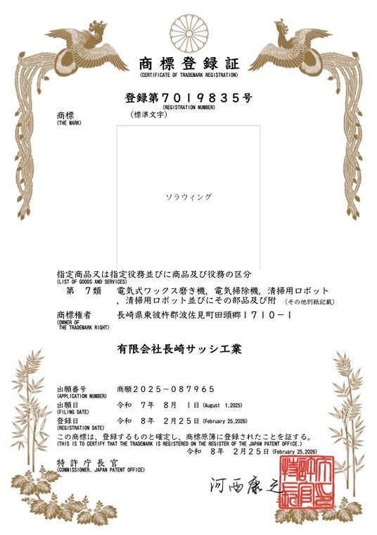 有限会社長崎サッシ工業(本社:長崎県東彼杵郡波佐見町、代表取締役:田中正一,以下「長崎サッシ工業」)は、開発中の高所窓洗浄ロボットの名称「SoraWing(ソラウィング)」について、商標登録出願を行い、このたび登録手続きが完了したことをお知らせいたします。あわせて、本製品のブランドロゴが正式に決定いたしました。