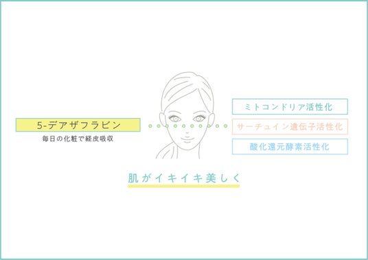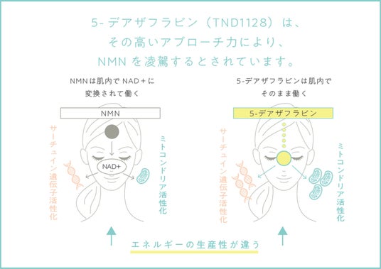 『5-デアザフラビン』(※2)は1960年代に発見され、近年では世界的権威のあるスウェーデンの医科大学でノーベル生理学・医学賞部門の選考委員会がある「カロリンスカ研究所」や日本の大学にて研究が進められている「ビタミンB2に似た構造を持つNAD+の類似作用成分」です。ミトコンドリア活性化、酸化還元酵素活性化、サーチュイン遺伝子活性化において、NMNの何倍ものパワーを持つことが実証された国際特許取得素材として世界から注目を集めています。つまりは細胞レベルから「健康寿命の延伸作用」「抗酸化作用」があると言える(※6)『5-デアザフラビン』(※2)を肌から直接取り入れることを実現しました。