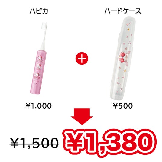 「電動付歯ブラシハピカ本体」1,000円(税抜)+「専用のケース」500円(税抜)=1,500円(税抜)のところ、通常販売価格1,380円(税抜)と大変お得なセットです。