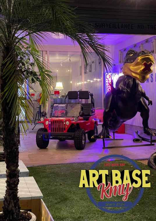 ART BASE KMY入口でお客様をお迎えする恐竜のオブジェ