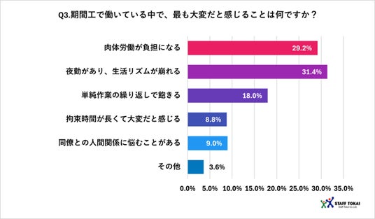 最も多いのが「夜勤があり、生活リズムが崩れる(31.4%)」であり、次いで「肉体労働が負担になる(29.2%)」、「単純作業の繰り返しで飽きる(18.0%)」という結果になりました。