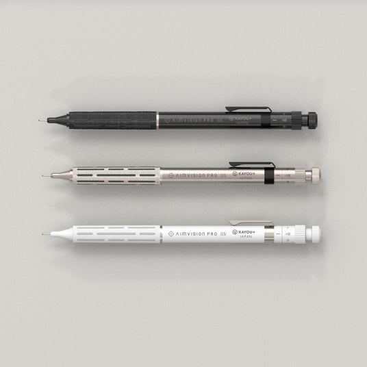 AIMVISION PROのスタンダードモデルとしてデザインされ、滑りにくいライン形状のラバーパーツにより、スケッチから速記まで幅広い用途に対応しています。前軸にはAIMVISION PROと同様の真鍮削り出し一体型パーツを採用し、後軸には握りやすさを考慮した八角形の樹脂製パーツを組み合わせています。