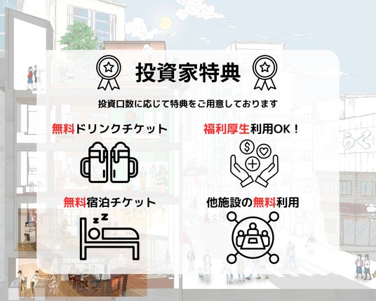 法人・個人いずれも投資可能で、金銭的なリターンに加え、宿泊無料チケットや飲食無料チケット券など法人にとっては福利厚生としても使用できる仕組みになっています。これにより、投資参画から関係人口につなげることで、これまで以上に地域社会に貢献し、空き家問題の解決に積極的に取り組んでいきたいと考えております。