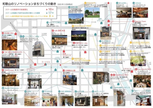 和歌山市中心市街地は高度経済成長期のモータリゼーションと大型商業施設の郊外開発などにより、都市のスプロール化(空洞化)が進んでいる背景から和歌山市が中心となって地域内事業者の発掘・育成と空き家のマッチングを行う「リノベーションスクール」を2014年から過去8回開催し、多様な事業が生まれています。