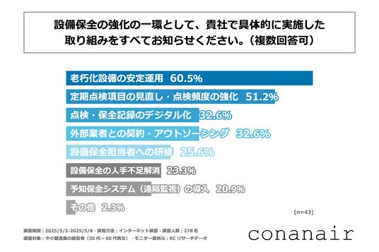 調査の最後、コスト削減のための取り組みとして「設備保全の強化」を行ったと回答された方に「設備保全の強化の一環として、具体的に実施した取り組み」を尋ねる設問への回答では、1位が「老朽設備の安定運用」で60.5%、2位が「定期点検項目の見直し・点検頻度の強化」で51.2%、3位が同率で「点検・保全記録のデジタル化」と「外部業者との契約・アウトソーシング」で32.6%、という結果になりました。また、4位以降も回答率20%を超える回答が複数並ぶ形となり、この結果から、設備保全強化のための施策は様々あることがわかりました。