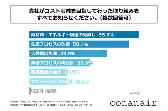 続いて、コスト削減を目指して何らかの取り組みを行っていると回答された方に「コスト削減を目指して行った取り組みのすべて」を尋ねる設問への回答では、1位が「原材料・エネルギー調達の見直し」で55.6%、2位が「生産プロセスの改善」で50.7%、3位が「人件費の削減」で39.5%という結果になりました。また、4位以降も回答率30%を超える回答や回答率20%近い回答が見られ、この結果から、製造業の中小企業が取り組んでいるコスト削減施策は多岐に渡ることが判明しました。