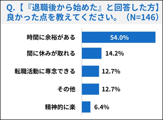 『退職後に開始した』と答えた146名に対し、『退職後に始めて良かった点』を調査したところ、1位は『時間に余裕がある(54.0%)』、2位は『間に休みが取れる(14.2%)』、3位は『転職活動に専念できる(12.7%)』と回答しました。在職中からの転職のデメリットと似た観点で、時間的制約に関する内容が中心となりました。