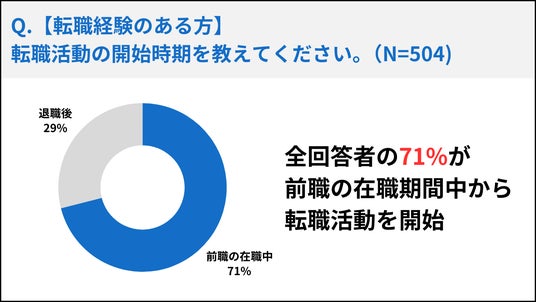 転職活動の開始時期について、『前職の在職期間中』『退職後』のいずれのタイミングで開始したかという設問に対し、71%の回答者が『前職の在職期間中から開始した』と回答しました。