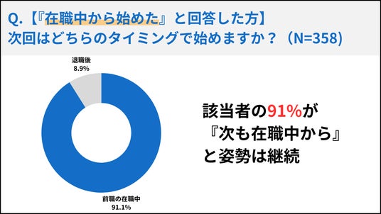 転職活動の開始時期について『前職の在職中に開始した』と答えた358名に対し、『次回はどちらのタイミングで転職活動を開始するか?』と調査したところ、91%が前回同様となる『次も在職中から転職活動を始める』と回答しました。