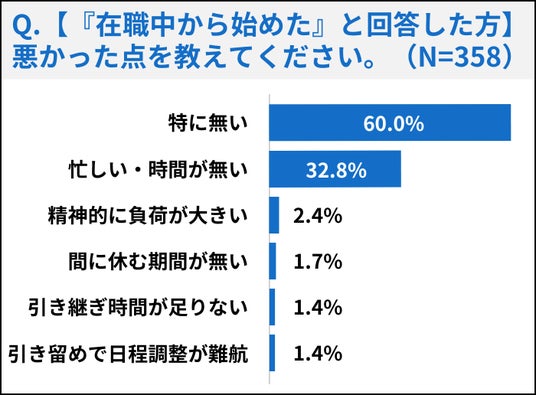 『前職の在職中に開始した』と答えた358名に対し、『在職中に始めて悪かった点』を調査したところ、1位は『特に無い(60.0%)』、2位は『忙しい・時間が無い(32.8%)』、3位は『精神的に負荷が大きい(2.4%)』と回答しました。在職中からの転職では、日程など時間的制約によるデメリットを感じる方が多いことが分かりました。