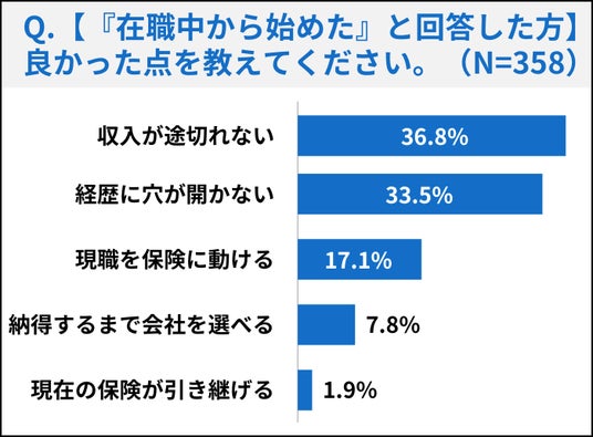 『前職の在職中に開始した』と答えた358名に対し、『在職中に始めて良かった点』を調査したところ、1位は『収入が途切れないこと(36.8%)』、2位は『経歴に穴が開かないこと(33.5%)』、3位は『現職を保険に動けること(17.1%)』と回答しました。結果、収入面での不安、空白期間に対する不安の払拭が、全体の約7割を占める結果となりました。