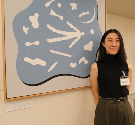 ~今回のアートに込めた想い~ 私が生きていく中で、「素敵だな」と心が動く瞬間や風景を人生の記録として制作しています。作品の1つは、日本能率協会のロゴの青を基調に、人同士が絡み合い、個性が関係しあいながら調和し、新たなことを生み出すプロセスを表現しています。断定的に描いていないため、作品を見る人の視点によって、見え方は変わってくると思っています。その「余白」をいかしながら、思考につながってほしいと考えています。