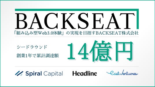 パートナー企業の既存サービスに組み込み、ユーザーにとって身近なサービスに融合した形でWeb3.0体験を提供し、ブロックチェーン技術の社会実装を目指すBACKSEAT株式会社(本社:東京都千代田区、代表取締役社長:林 政泰、以下「BACKSEAT」)は、このたびSpiral Capital及びHeadline Asiaを共同リード投資家、East Venturesをフォロー投資家として迎え、第三者割当増資を実施したので、お知らせいたします。創業からの累計資金調達額は約14億円となりました。