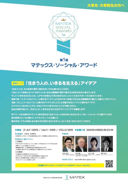 ガラス卸販売のマテックス株式会社(東京都豊島区、代表取締役社長:松本 浩志)は、大学生・大学院生向けの社会デザインアイデアコンテスト「第1回マテックス・ソーシャル・アワード」の募集を開始します。
