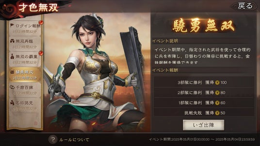 3)無双の覇業(5月1日~5月7日):イベント期間中、プレイヤーは行動ポイントを消費して、武芸、謀略、およびお金の数値を向上させることができます。プレイヤーは毎日「目標」を達成することで、その内容に応じて様々な報酬を受け取ることができます。