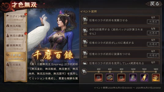 6)千磨百錬(5月1日~5月7日):コラボ武将を使用してミッションを達成すると、豊富な報酬を獲得できます。