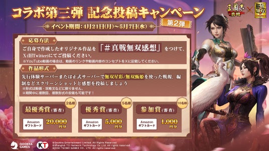 コラボ関連の書道・イラスト・写真、あるいは無双星彩と無双甄姫に関する戦報・編制などのスクリーンショットと感想をシェアすると、Amazonギフトカード1,000円分を獲得するチャンスがあります。受賞者はさらに5,000円分、20,000円分のAmazonギフトカードを獲得できます。