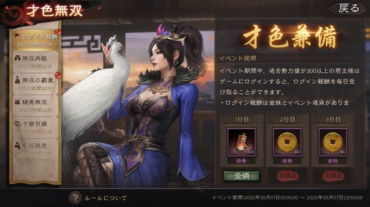4)才色兼備(5月1日~5月7日):イベント期間中、過去勢力値が300以上のプレイヤーはゲームにログインすると、ログイン報酬を毎日受け取ることができます。ログイン初日に獲得できるイベント通貨を使用すると、「無双甄姫」と無料で交換できます。
