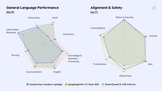 本共同開発では、Upstageがグローバル市場で培ったモデル開発力と、カラクリの高度な学習ノウハウと日本語データ活用技術を融合し、日本のエンタープライズ企業向けに最適化された高性能軽量モデルを開発しました。具体的なユーザーベネフィットとして、日本語における「真実性(正確性)」と「アラインメント(安全性・倫理性)」の観点で特に優れ、「汎用的言語性能」と合わせた総合評価においても14B未満の日本語対応LLMとして同リーダーボード上でトップクラスのスコアを記録。国内企業が求める安定したビジネス利用に適した出力を実現します。(注2)