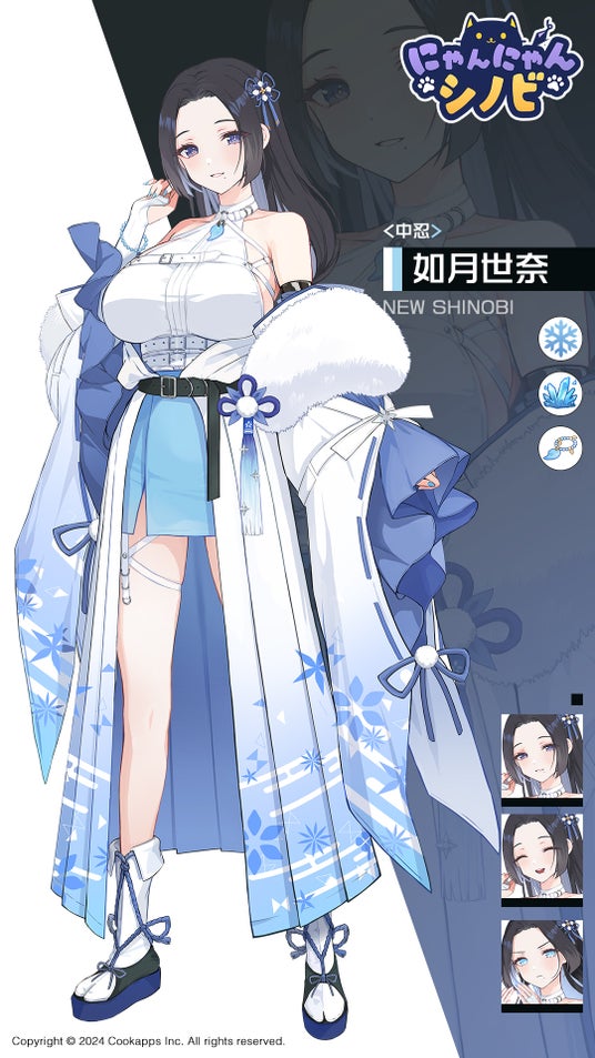 水遁術を操る中級忍者「如月セナ」が新たに参戦。メインスキルは氷の力を封じ込めた「氷牢」。
