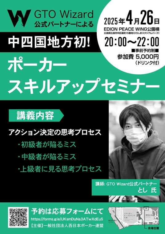 本セミナーは「本気でポーカーが強くなりたい・学びたい」という方に向けたイベントとなっております。講師として登壇する「とし」氏は ポーカーの勉強ツールの代表格『GTO Wizard』の公式パートナーも務める日本屈指の実力者。全国の大型イベントの解説や自身の「YouTube」や「note」などのコンテンツでもポーカーのスキルアップにつながる情報を発信しています。