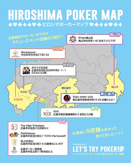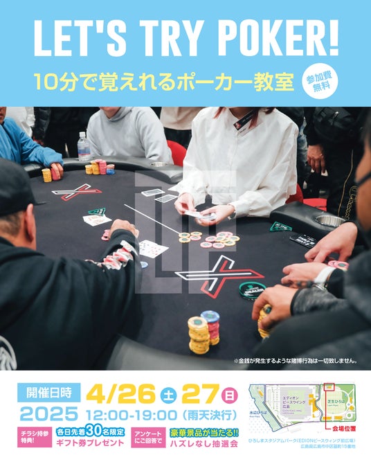 一般社団法人西日本ポーカー連盟は、広島市にてポーカーの無料体験会『 LET'S TRY POKER ! 』を4月26日(土)と4月27日(日)に開催します。本イベントは、ポーカの認知度拡大を目標として、少しでもポーカーに興味をもった方々が「安全にポーカーに触れることができる機会を創りたい!」という思いから発足しました。