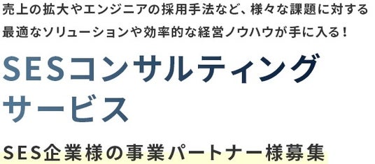 本サービスは、SES事業の立ち上げから営業・人事の責任者を務めた経験豊富なコンサルタントが、エンジニア採用、パートナーアライアンス、業務効率化、資本業務提携など、SES事業の成長に必要な各フェーズを一気通貫でサポートするものです。