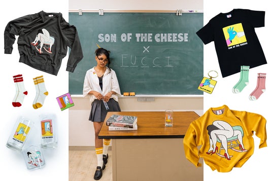 今回のコラボレーションは全部で10アイテム。Fucciのグラフィックを大胆にプリントしたTシャツ、スウェット、ニット、キャップ、靴下、キーチェンやピン、そしてインテリアのグラスの展開です。SON OF THE CHEESEらしい「大人の遊び心」と、Fucciのポップなユーモアに潜む官能的な魅力が融合し、日常を鮮やかに彩るコレクションに仕上がりました。