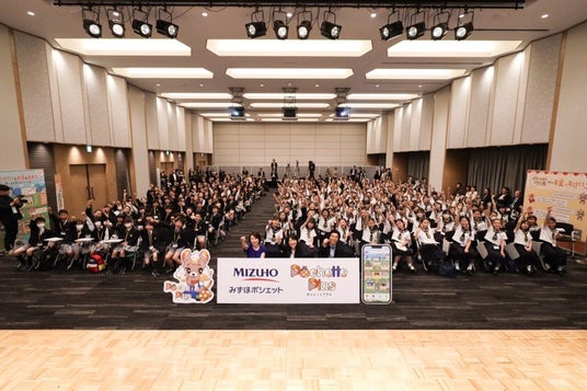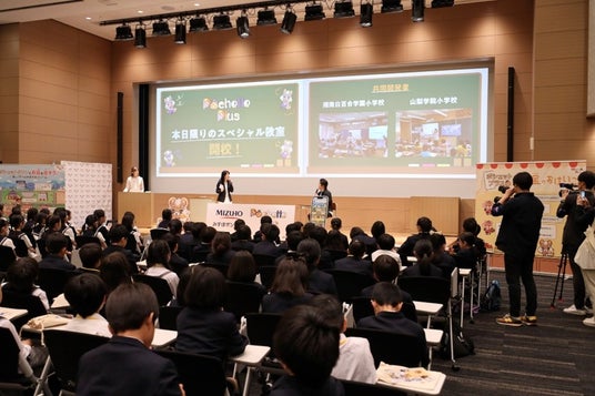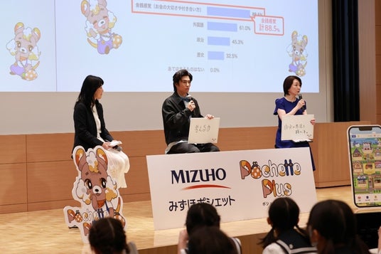 本発表会では本アプリの共同開発者でもある湘南白百合学園小学校・山梨学院小学校の児童約200名にご参加いただき、「みずほポシェットスペシャル教室」を開催。スペシャルゲストとして俳優の中尾明慶さんとともにアプリで学べる内容をその場で受講いただきました。