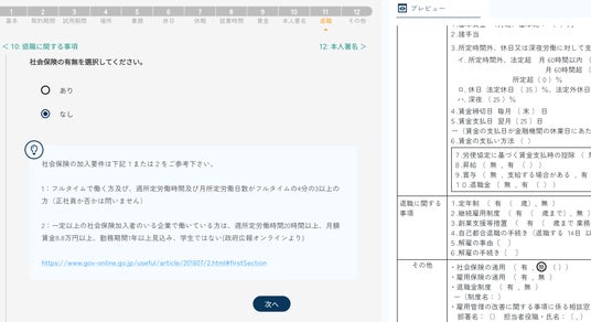 直感的な契約書作成:作成モードは選択・入力・直接編集モードの3つ。選択作成モードはガイドや厚労省のリンクを参考にしながら選択肢を選択するだけでプレビュー画面に即反映、初心者からプロまでスムーズに雇用契約書を作成可能。