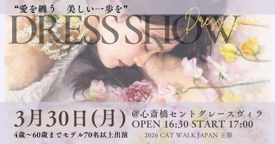 CAT WALK JAPAN(所在地:大阪府大阪市、代表:西村祐香)は、2026年3月30日(月)に大阪・心斎橋セントグレースヴィラにて、10以上のウェディングドレスブランドと4~60歳までの総勢70名のモデルが参加する~DRESS SHOW~(関連ページ:https://square.link/u/u22zPUnq)を開催いたします。