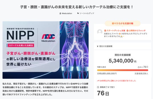 メドキュレーション株式会社(本社:静岡県、代表取締役:柴垣知広)は、子宮がん・膀胱がん・直腸がんに対するカテーテルを用いた治療「NIPP(閉鎖循環下骨盤内非均衡灌流療法)」の保険適用を目指し、2025年5月14日(水)にCAMPFIREで開始したクラウドファンディングにおいて、開始からわずか4日で、229人の支援者により1stゴールの500万円を達成したことをお知らせします。